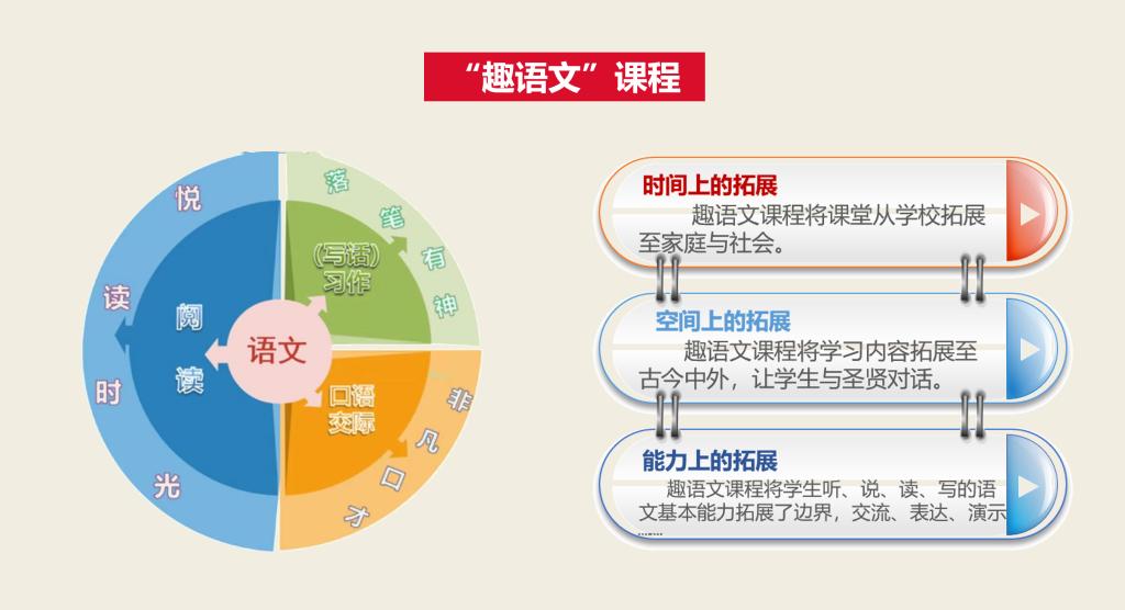 趣语文课程是学校在顺利实施国家课程的前提下,以培养小学生语文核心素养为目标,立足“中华文化的传承、正确价值观的引导、语言表达的提升、思维品质的发展、文学审美的培养”,以“兴趣”、“理趣”、“志趣”为特征,通过“悦读时光、落笔有神、非凡口才”三大板块组合,引导学生语文学习有兴趣,过程有理趣,长远有志趣。